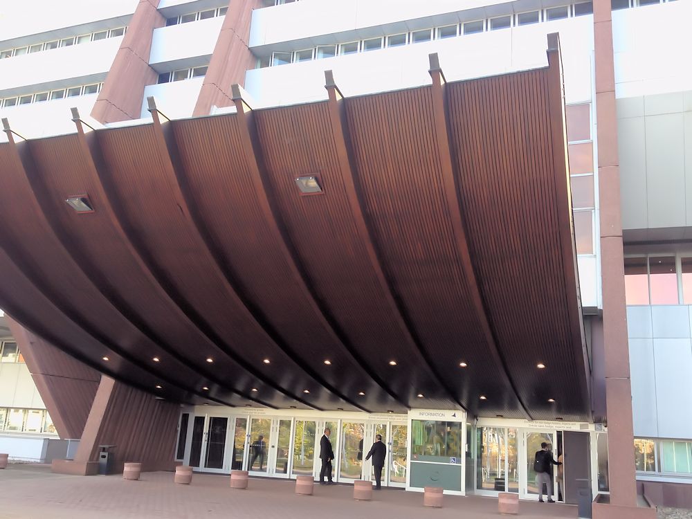 Als ich 2014 das erste Mal vor dem Palais de l’Europe stand, musste ich wirklich an Science-Fiction-Filme der 1970er Jahre denken. Das Gebäude hat etwas raumfrachterartiges. Es wurde 1977 erbaut und beherbergte bis 1999 das Europäische Parlament und den Europarat. Seit 1999 tagt nur noch die Parlamentarische Versammlung des Europarats dort.